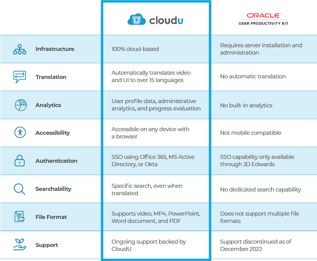 Oracle's ® User Productivity Kit (UPK) support ends in December 2022. CloudU offers the best UPK alternative, designed to preserve, enhance, and modernize your training assets.